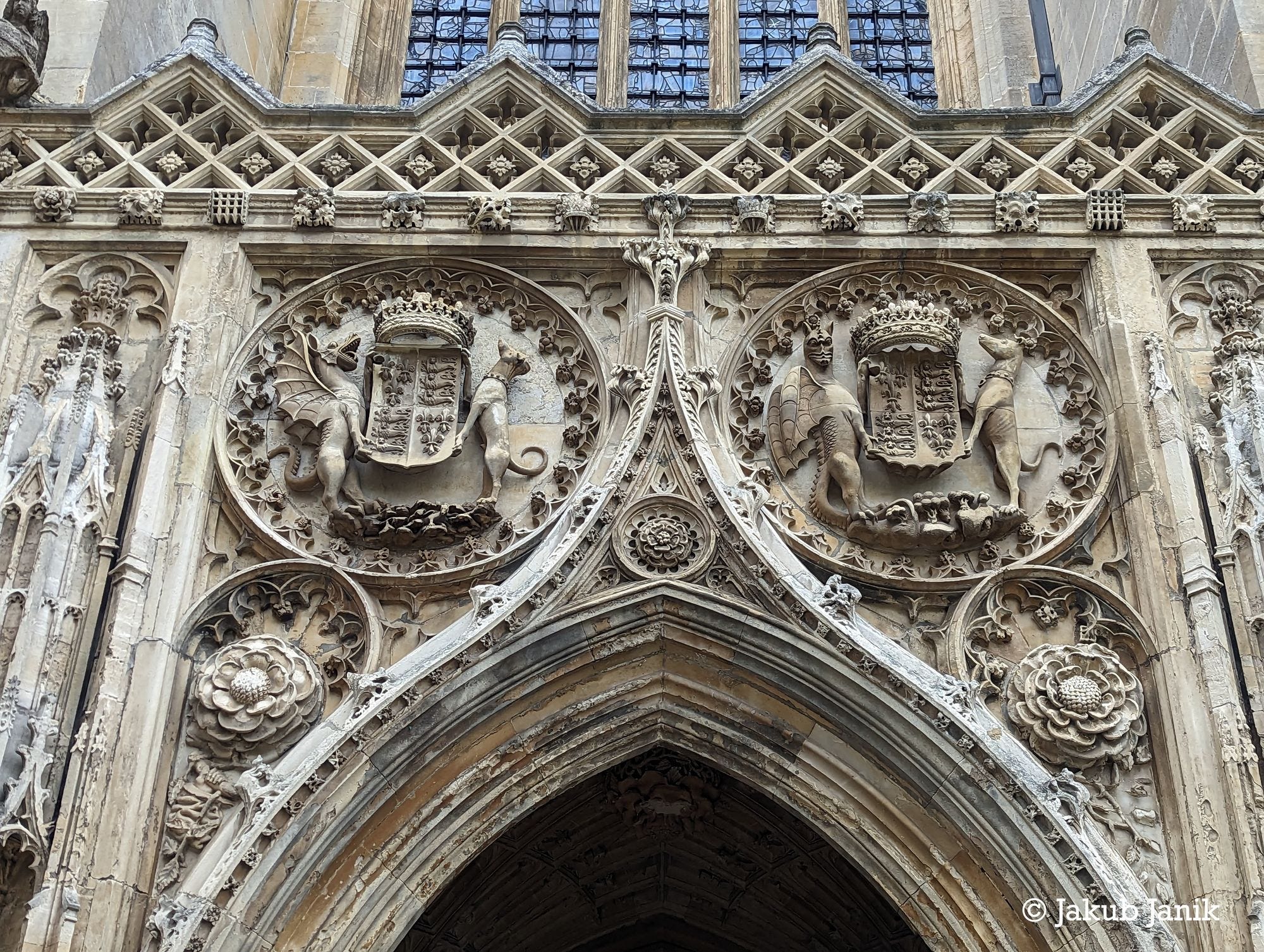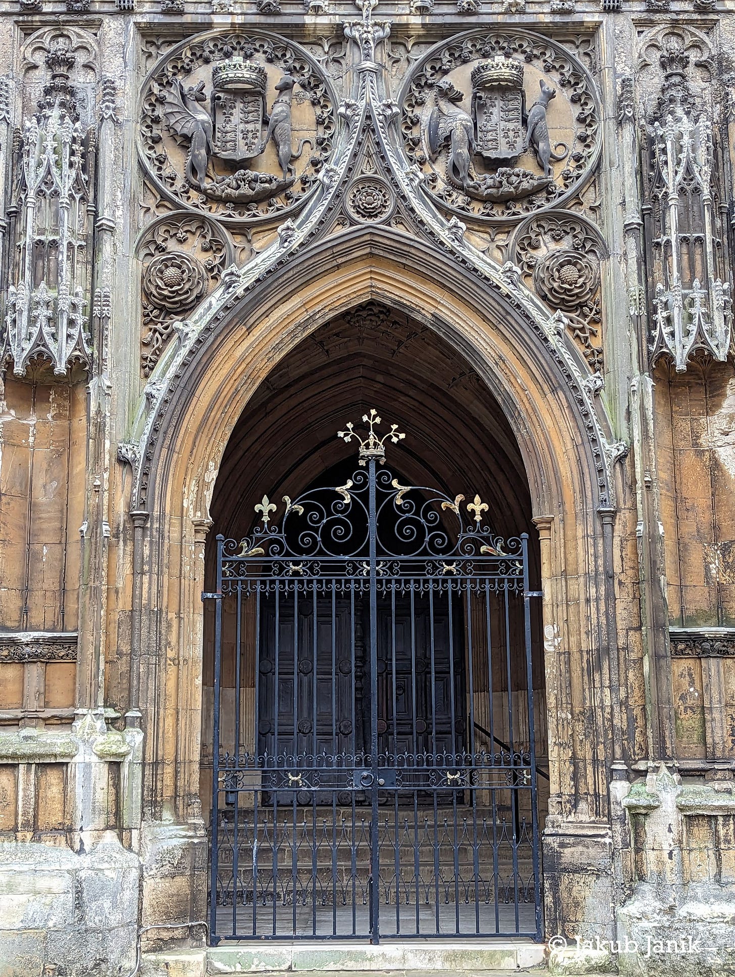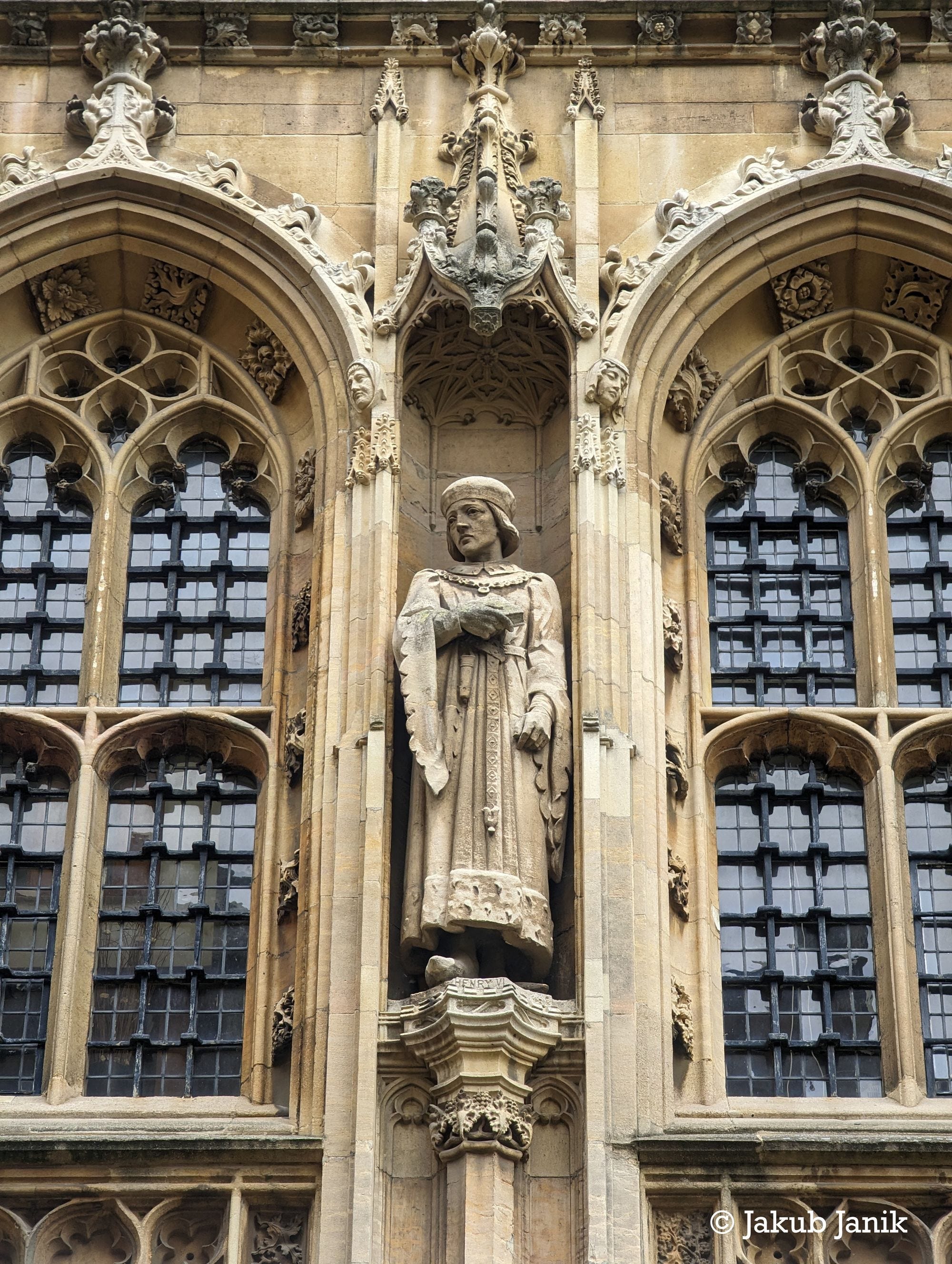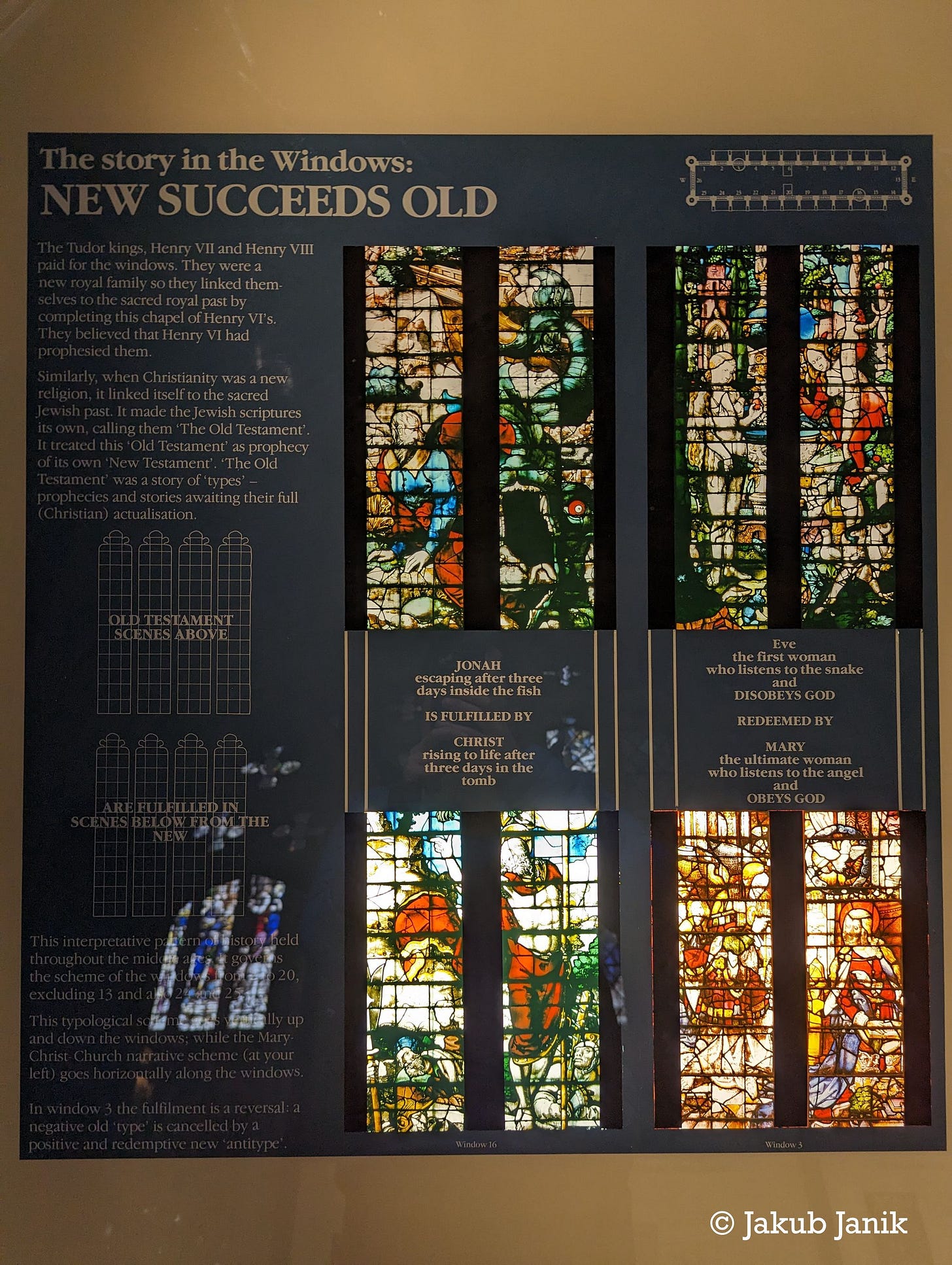 Henryk VIII z dynastii Tudorów zaznacza swoją obecność w wielu elementach wystroju, m.in. wcielił się w króla Salomona na jednym z wspaniałych witraży, a także pozostawił swoje inicjały, wyrzeźbione w potężnej drewnianej przegrodzie chórowej, wspierającej słynne organy kaplicy. Wśród ornamentów imponującej przegrody wypatrzeć można też inicjały jego drugiej żony Anny Boleyn, bo organy ufundowane przez króla w 1532-36 roku miały upamiętnić zawarcie z nią ślubu. Zakrawa to na wyjątkową perfidię, gdyż Henryka VIII znamy dobrze jako despotę i krwawego okrutnika, który miał sześć żon. Pozbywał się ich bez skrupułów, gdy kolejna kobieta budziła jego zainteresowanie i dwie z nich - Anna Boleyn i Katarzyna Howard skończyły na szafocie.