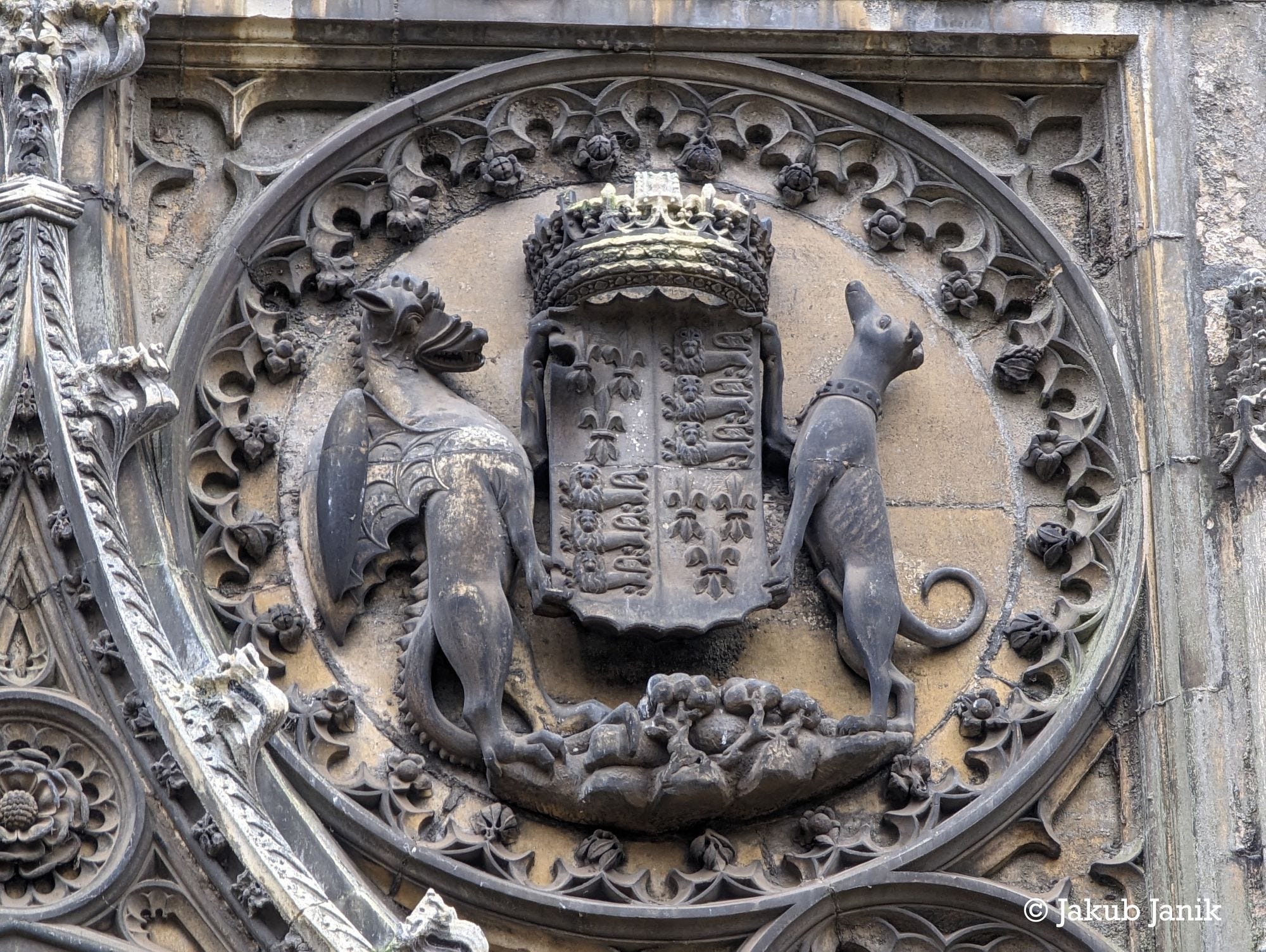 Chart jest symbolem rodziny Beaufort (a także Lancashire i Tudor); smok natomiast jest znakiem rodowym Tudorów. Matką Henryka VII była Margaret Beaufort, hrabina Richmond, jego ojcem - Edmund z Tudorów. Margaret miała tylko 13 lat gdy urodziła Henryka; a jego ojciec Edmund zmarł jeszcze przed narodzinami syna. Margaret, która wychodziła za mąż ponownie trzykrotnie, ufundowała dwa kolejne kolegia w Cambridge - St John’s College and Christ’s College.