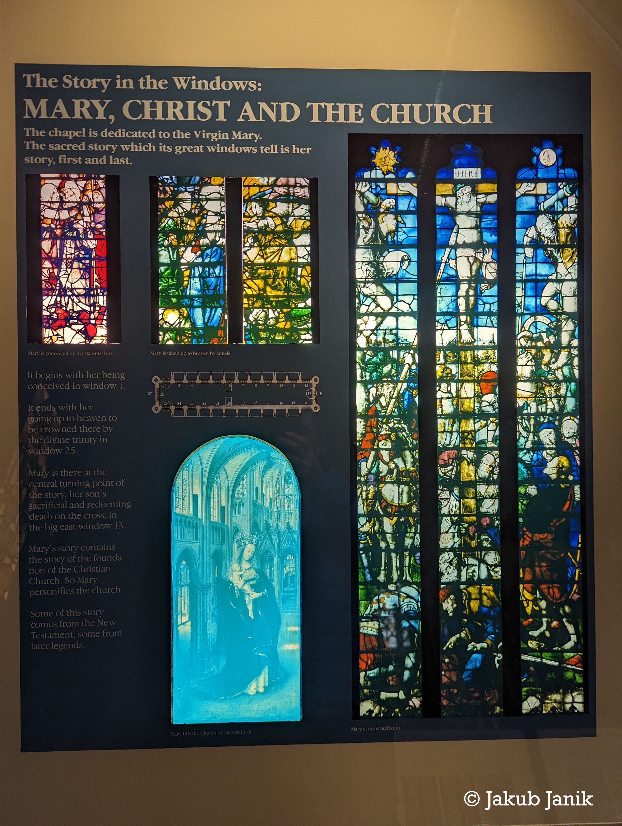 W kaplicy znajduje się największe na świecie sklepienie wachlarzowe i 26 dużych okien z witrażami (24 z nich pochodzą z XVI wieku).